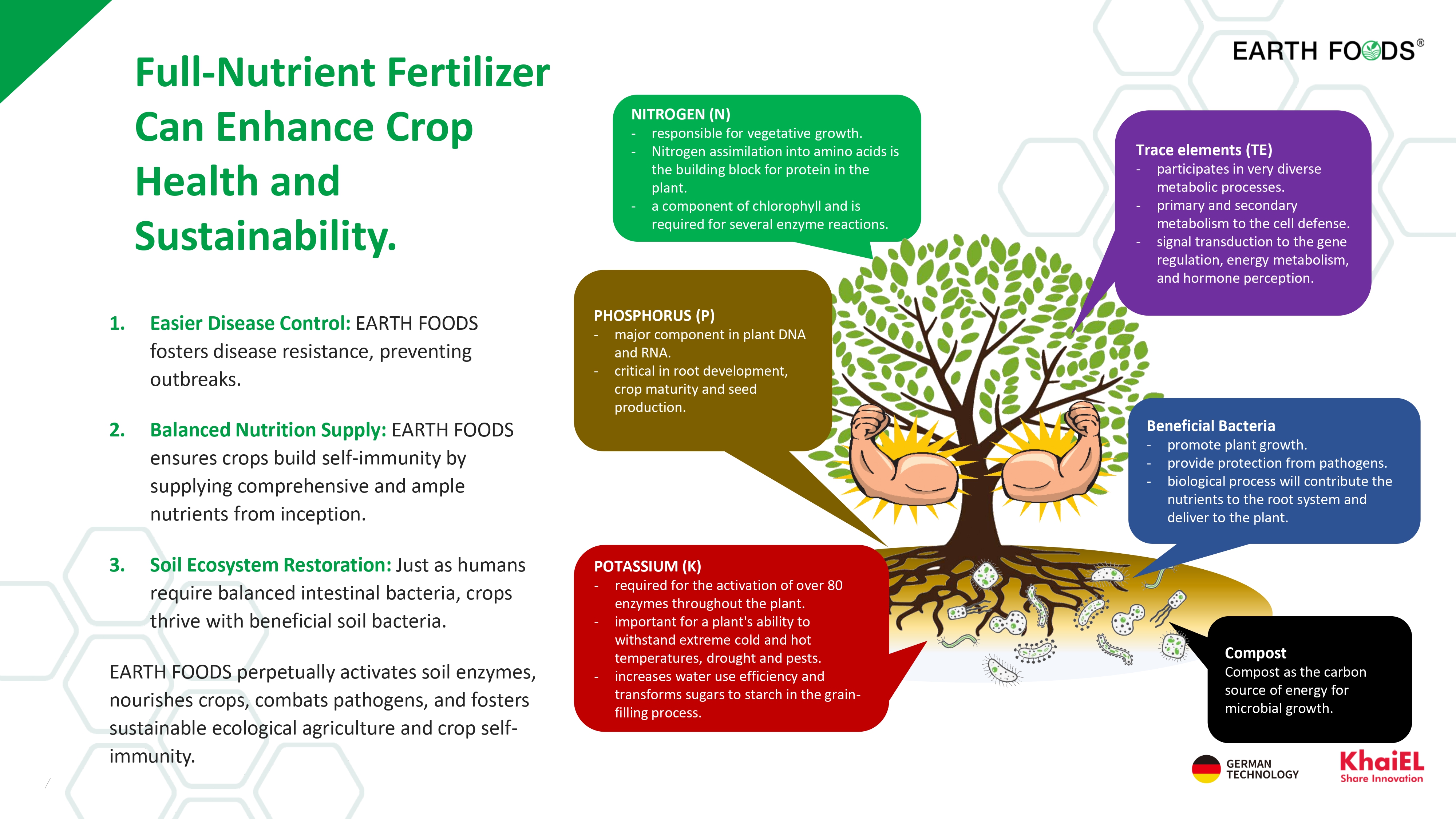 To realize the vision of 'Fair Trade for Living Soil,' the original NPK compound fertilizer, with its mere three elements, undergoes a remarkable transformation into a rich blend of multiple nutrients with Earth Foods EcoPlus Fertilizer. This revolutionary process restores all lost soil nutrients in a single application, making a bold statement in global sustainability.